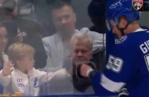 Filho de atacante do Tampa Bay Lightning ganha mimo do pai antes de jogo e amplia ‘coleção’ de brinquedos