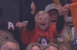 Pequeno fã do Anaheim Ducks, de 4 anos, rouba a cena com reação e risadas no telão e conhece jogadores