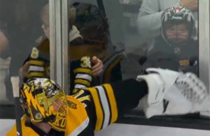 Filho do goleiro finlandês do Boston Bruins vai a jogo vestido como o pai (só que fofo) e ganha lembrança