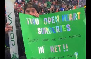 Goleiro do Dallas Stars presenteia jovem fã ao ver cartaz que dizia sobre ter superado duas cirurgias de coração