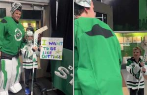 Goleiro do Dallas Stars presenteia jovem (grande) fã que levou cartaz com mensagem sobre o ídolo