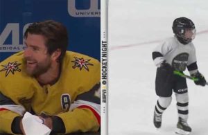 Do banco, defensor do Vegas Golden Knights vê filhos gêmeos jogarem hóquei durante o intervalo de jogo
